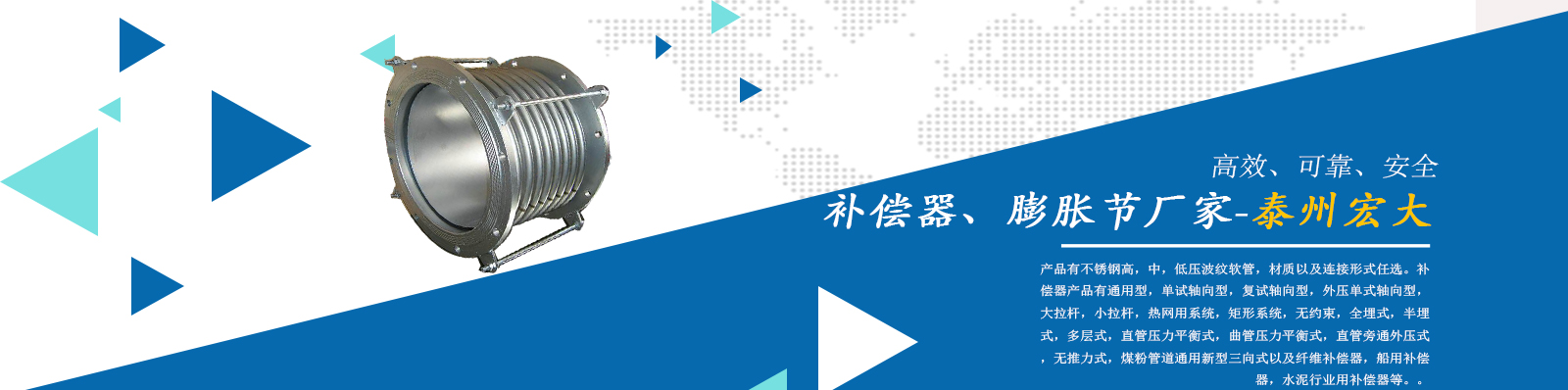 泰州市宏大機械設(shè)備有限公司是一個企業(yè)內(nèi)部管理嚴謹,工作作風(fēng)穩(wěn)健,職工素質(zhì)水平較高,經(jīng)濟實力雄厚,產(chǎn)品質(zhì)量放心,外部形象良好的企業(yè)。本公司專業(yè)從事補償器廠家,膨脹節(jié)廠家,膨脹節(jié)補償器,其中有不銹鋼高,中,低壓波紋軟管,材質(zhì)以及連接形式任選。補償器產(chǎn)品有通用型,單試軸向型,復(fù)試軸向型,外壓單式軸向型,大拉桿,小拉桿,熱網(wǎng)用系統(tǒng),矩形系統(tǒng),無約束,全埋式,半埋式,多層式,直管壓力平衡式,曲管壓力平衡…...